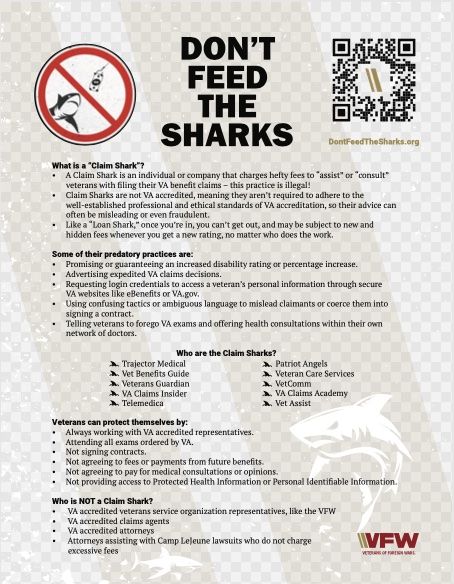 A Claim Shark is an individual or company that will illegally charge heavy fees to "assist" a veteran with filling out their VA benefit claims. Protect yourself by reading the document below to be aware of their practices and names!